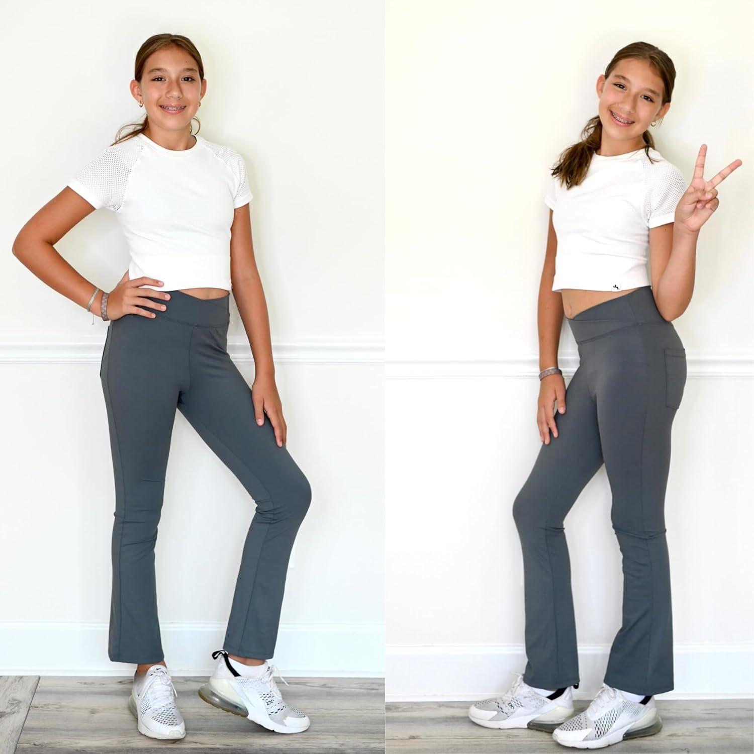 BIG ELEPHANT Girls Flare Leggings with Pockets, Crossover High Waist Bell Bottom Yoga Pants for Dance & Everyday Wear(Dark Gray)