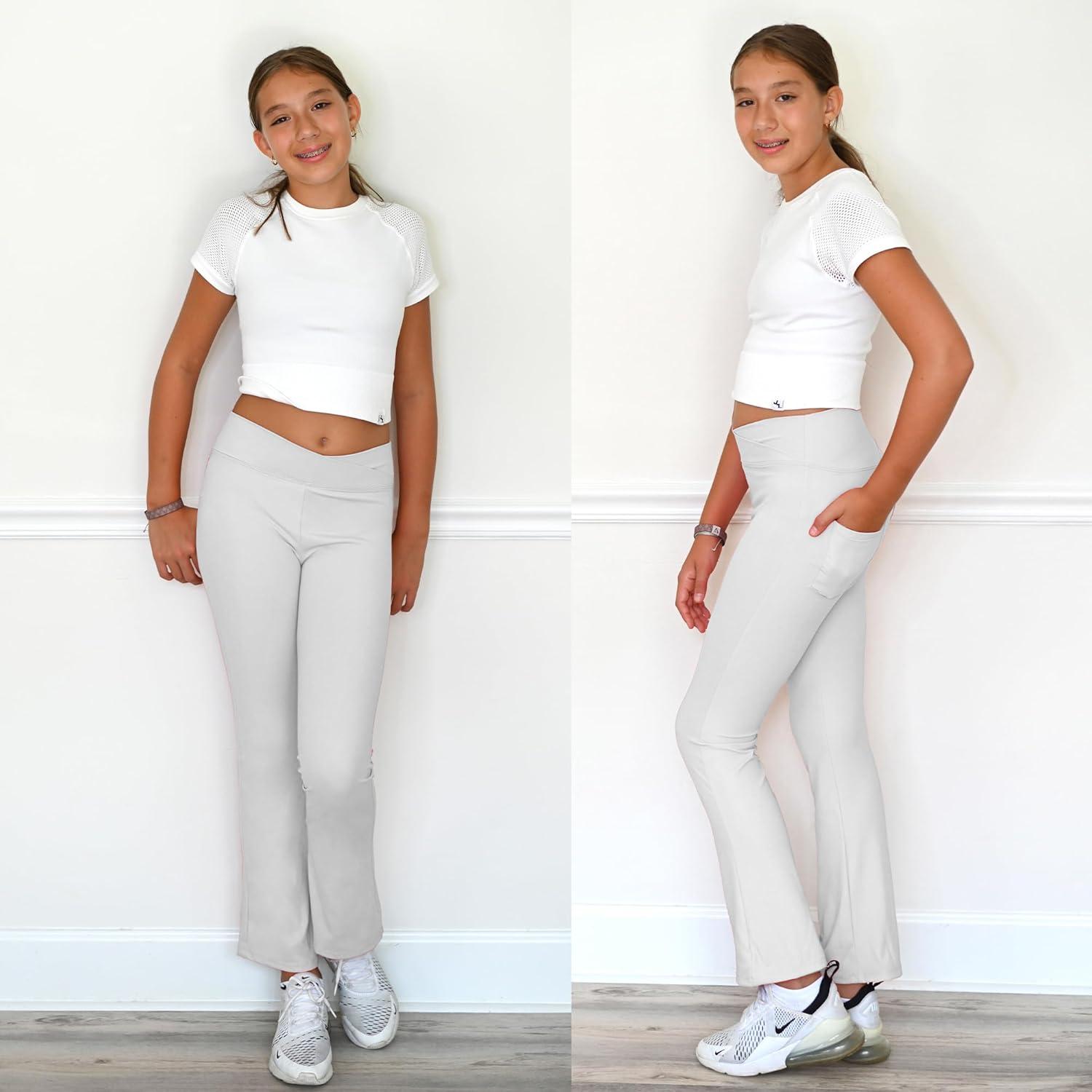 BIG ELEPHANT Girls Flare Leggings with Pockets, Crossover High Waist Bell Bottom Yoga Pants for Dance & Everyday Wear(Dark Gray+light Gray+pink)